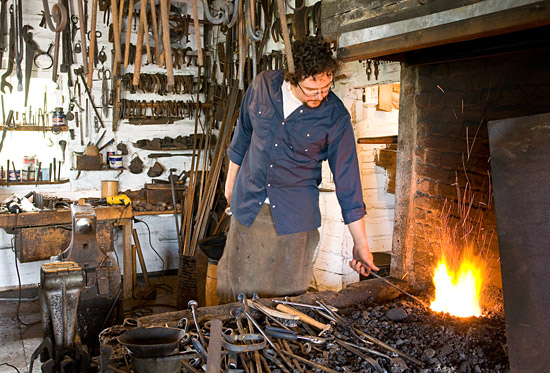 Tous les jours pendant la saison de visites, un forgeron est à l’oeuvre et crée des pièces de ferronnerie qu’il est possible d’acquérir. Par cette présence, le feu brûle à nouveau dans l’âtre et assure le lien entre installations traditionnelles et pratiques actuelles de forge.
